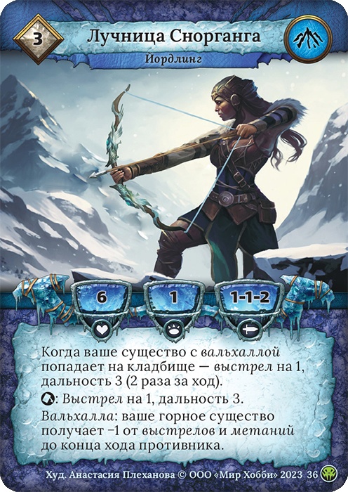 | Текст | Когда ваше существо с вальхаллой попадает на кладбище — выстрел на 1, дальность 3 (2 раза за ход). Вальхалла: ваше горное существо получает -1 от выстрелов и метаний до конца хода противника. |
