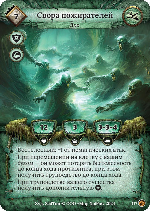 | Текст | Бестелесный: -1 от немагических атак. При перемещении на клетку с вашим духом — он может потерять бестелесность до конца хода противника, при этом получить трупоедство до конца хода. При трупоедстве вашего существа — получить дополнительную |