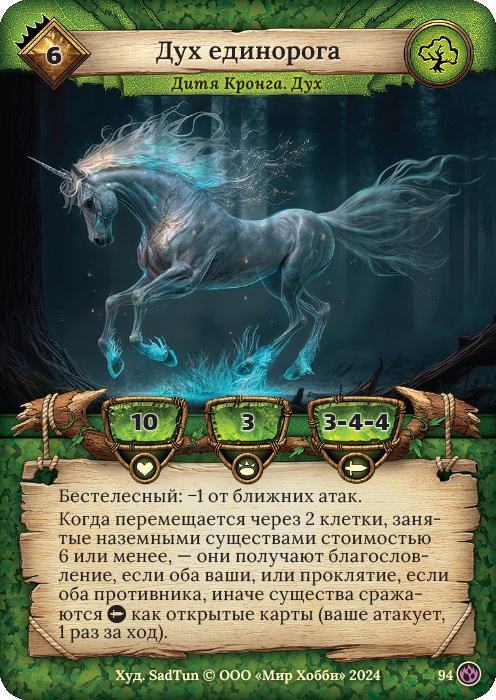 | Текст | Бестелесный: -1 от ближних атак. Когда перемещается через 2 клетки, занятые наземными существами стоимость 6 или менее, — они получают благословление, если оба ваши, или проклятие, если оба противника, иначе существа сражаются |